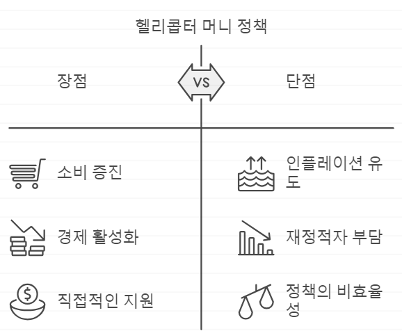 헬리콥터 머니 뜻, 헬리콥터 머니 정책 장점과 단점 및 경제에 미치는 영향 이야기입니다.헬리콥터 머니(Helicopter Money)란? 정부나 중앙은행이 경기 부양을 위해 직접 국민에게 돈을 지급하는 비전통적 통화 정책을 말합니다.이 용어는 경제학자 밀턴 프리드먼(Milton Friedman)이 처음 사용했으며, 마치 헬리콥터가 돈을 뿌리는 것처럼 중앙은행이 화폐를 무상으로 공급해 경제에 활력을 주려는 개념에서 유래되었습니다. 헬리콥터 머니는 재정정책과 통화정책이 결합된 형태로, 일반적으로 정부가 재정적자를 중앙은행이 발행한 화폐로 충당해 이를 국민에게 직접 지급하거나, 중앙은행이 국민에게 일정 금액을 직접 배포하는 방식으로 이루어집니다. 간단히 말해, 중앙은행이 시중에 돈을 직접 풀어 경기를 부양하고..